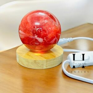 Quả Bi cầu phong thủy đá núi lửa Đỏ 8cm tặng đế gỗ có đèn